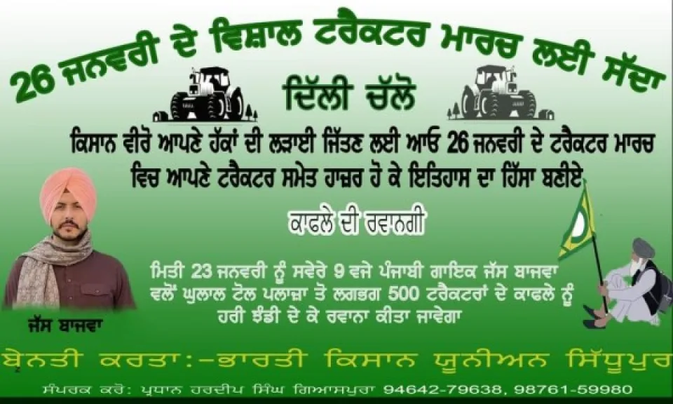 26,ਜਨਵਰੀ ਦੇ ਵਿਸ਼ਾਲ ਟਰੈਕਟਰ ਮਾਰਚ ਲਈ ਸਦਾ ਦਿੱਤਾ।