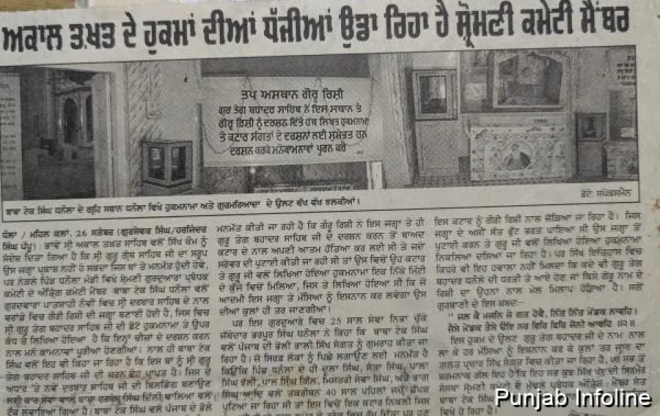 ਅੱਜ ਤਖਤ ਦਮਦਮਾ ਸਾਹਿਬ ਦੇ ਨਿਯੁਕਤ ਕੀਤੇ ਗਏ ਜਥੇਦਾਰ ਬਾਬਾ ਟੇਕ ਸਿੰਘ ਧਨੌਲਾ ਦੀ ਕਹਾਣੀ ਦੱਸਣ ਲੱਗਿਆ ਹਾਂ ਇਸ ਤੋਂ ਪਤਾ ਲੱਗੇਗਾ ਕਿ ਬਾਬਾ ਜੀ ਸਿੱਖੀ ਪ੍ਰਤੀ ਕਿਨੇ ਕੁ ਸੁਹਿਰਦ ਹਨ। ਉਨ੍ਹਾਂ ਦਿਨਾਂ ਵਿਚ ਜੋਗਿੰਦਰ ਸਿੰਘ ਵਾਲਾ ਸਪੋਕਸਮੈਨ ਚੰਗਿਆੜੇ ਕੱਢੀ ਜਾਂਦਾ ਸੀ। ਜਿਲ੍ਹਾ ਇਚਾਰਜ ਜਗਸੀਰ ਸਿੰਘ ਸੰਧੂ ਘੁਣਤਰੀ (Jagsir Singh Sandhu Ghuntri ) ਸਨ। ਗੁਰਮਿਤ ਖਿਲਾਫ ਗੁਰੂਘਰਾਂ ਅਤੇ ਡੇਰਿਆਂ ਵਿਚ ਚੱਲ ਰਹੀਆਂ ਕੁਰੀਤੀਆਂ ਨੂੰ ਵਿਸ਼ੇਸ਼ ਤੌਰ ਤੇ ਕਵਰ ਕੀਤਾ ਜਾਂਦਾ ਸੀ। ਇਨ੍ਹਾਂ ਹੀ ਦਿਨਾਂ ਵਿਚ ਕਸਬਾ ਧਨੌਲਾ ਵਿਚ ਇਕ ਗੁਰੂਘਰ ਦੇ ਗੱਦੀਦਾਰ ਬਾਬਾ ਟੇਕ ਸਿੰਘ ਧਨੌਲਾ ਨੇ ਪਰਚੇ ਛਾਪਕੇ ਅਫਵਾਹ ਉਡਾਈ ਇਕ ਇਸ ਗੁਰੂਘਰ ਵਿਚ ਤਲਾਅ ਦੀ ਖੁਦਾਈ ਸਮੇਂ ਗੁਰੂ ਤੇਗ ਬਹਾਦਰ ਜੀ ਦਾ ਹੁਕਮਨਾਮਾ ਨਿੱਕਲਿਆ ਹੈ ਜਿਸ ਵਿਚ ਇਕ ਕਥਿੱਤ 'ਗੌਰੂ ਰਿਸ਼ੀ' ਦਾ ਵੀ ਜ਼ਿਕਰ ਸੀ ਦੱਸਿਆ ਜਾ ਰਿਹਾ ਸੀ ਕਿ ਗੌਰੂ ਰਿਸ਼ੀ ਗੁਰੂ ਜੀ ਨੇ ਗੁਰੂ ਜੀ ਦੇ ਦਰਸ਼ਨ ਕਰਕੇ ਆਪਣੇ ਢਿੱਡ ਵਿਚ ਕਟਾਰ ਮਾਰਕੇ ਹੱਤਿਆ ਕਰ ਲਈ ਤਾਂ ਗੁਰੂ ਜੀ ਨੇ ਆਖਿਆ ਕਿ ਇਸ ਤਲਾਅ ਵਿਚ ਜਿਹੜਾ ਮੱਸਿਆ ਵਾਲੇ ਦਿਨ ਇਸ਼ਨਾਨ ਕਰੇਗਾ ਉਸ ਦੀਆਂ ਕੁਲਾਂ ਤਰ ਜਾਣਗੀਆਂ। ਇਹ ਸਭ ਗੱਲਾਂ ਗੁਰਮਤਿ ਖਿਲਾਫ ਸਨ ਪਰ ਕੀਤੇ ਗਏ ਪ੍ਰਚਾਰ ਸਦਕਾ ਹਰ ਮੱਸਿਆ ਹਜਾਰਾਂ ਦੀ ਗਿਣਤੀ ਵਿਚ ਲੋਕ ਇਥੇ ਇਸ਼ਨਾਨ ਕਰਨ ਆਉਣ ਲੱਗ ਪਏ। ਇਹ ਮਨਮਤਿ ਅੱਗ ਵਾਂਗ ਫੈਲ ਰਹੀ ਸੀ ਜਿਸ ਨੂੰ ਰੋਕਣਾ ਬਹੁਤ ਜਰੂਰੀ ਸੀ।