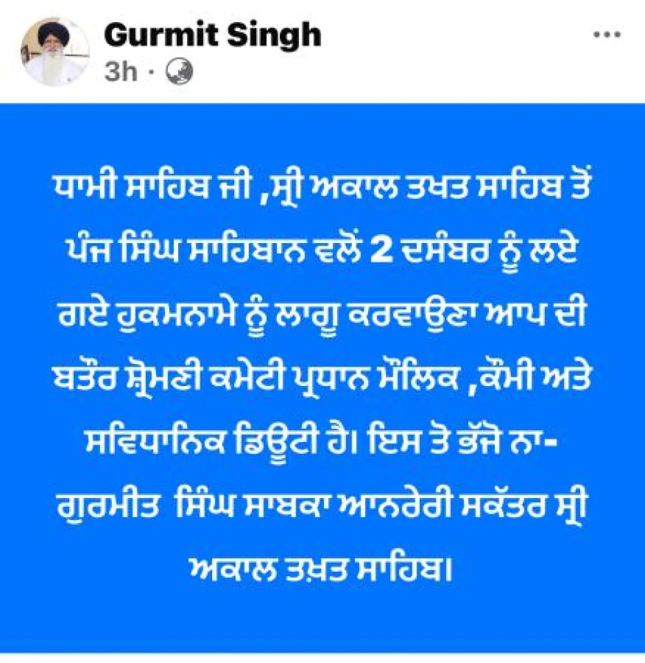 ਗੁਰਮੀਤ ਸਿੰਘ ਨੇ ਆਪਣੇ ਫੇਸਬੁਕ ਪੋਸਟ ਰਾਹੀਂ ਧਾਮੀ ਨੂੰ ਸੰਦੇਸ਼ ਦਿੰਦਿਆਂ ਲਿਖਿਆ: