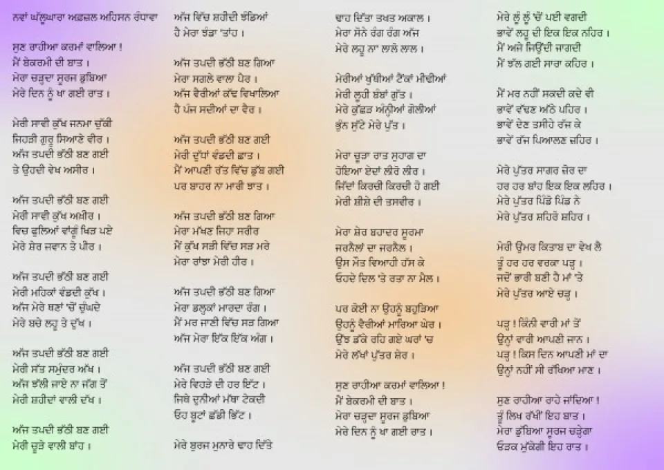 ਨਵਾਂ ਘੱਲੂਘਾਰਾ ਅਫ਼ਜ਼ਲ ਅਹਿਸਨ ਰੰਧਾਵਾਸੁਣ ਰਾਹੀਆ ਕਰਮਾਂ ਵਾਲਿਆ !ਮੈਂ ਬੇਕਰਮੀ ਦੀ ਬਾਤ ।ਮੇਰਾ ਚੜ੍ਹਦਾ ਸੂਰਜ ਡੁਬਿਆਮੇਰੇ ਦਿਨ ਨੂੰ ਖਾ ਗਈ ਰਾਤ ।ਮੇਰੀ ਸਾਵੀ ਕੁੱਖ ਜਨਮਾ ਚੁੱਕੀਜਿਹੜੀ ਗੁਰੂ ਸਿਆਣੇ ਵੀਰ ।ਅੱਜ ਤਪਦੀ ਭੱਠੀ ਬਣ ਗਈਤੇ ਉਹਦੀ ਵੇਖ ਅਸੀਰ ।ਅੱਜ ਤਪਦੀ ਭੱਠੀ ਬਣ ਗਈਮੇਰੀ ਸਾਵੀ ਕੁੱਖ ਅਖ਼ੀਰ ।ਵਿਚ ਫੁਲਿਆਂ ਵਾਂਗੂੰ ਖਿੜ ਪਏਮੇਰੇ ਸ਼ੇਰ ਜਵਾਨ ਤੇ ਪੀਰ ।ਅੱਜ ਤਪਦੀ ਭੱਠੀ ਬਣ ਗਈਮੇਰੀ ਮਹਿਕਾਂ ਵੰਡਦੀ ਕੁੱਖ ।ਅੱਜ ਮੇਰੇ ਥਣਾਂ 'ਚੋਂ ਚੁੰਘਦੇਮੇਰੇ ਬਚੇ ਲਹੂ ਤੇ ਦੁੱਖ ।ਅੱਜ ਤਪਦੀ ਭੱਠੀ ਬਣ ਗਈਮੇਰੀ ਸੱਤ ਸਮੁੰਦਰ ਅੱਖ ।ਅੱਜ ਝੱਲੀ ਜਾਏ ਨਾ ਜੱਗ ਤੋਂਮੇਰੀ ਸ਼ਹੀਦਾਂ ਵਾਲੀ ਦੱਖ ।ਅੱਜ ਤਪਦੀ ਭੱਠੀ ਬਣ ਗਈਮੇਰੀ ਚੂੜੇ ਵਾਲੀ ਬਾਂਹ ।ਅੱਜ ਵਿੱਚ ਸ਼ਹੀਦੀ ਝੰਡਿਆਂਹੈ ਮੇਰਾ ਝੰਡਾ 'ਤਾਂਹ ।ਅੱਜ ਤਪਦੀ ਭੱਠੀ ਬਣ ਗਿਆਮੇਰਾ ਸਗਲੇ ਵਾਲਾ ਪੈਰ ।ਅੱਜ ਵੈਰੀਆਂ ਕੱਢ ਵਿਖਾਲਿਆਹੈ ਪੰਜ ਸਦੀਆਂ ਦਾ ਵੈਰ ।ਅੱਜ ਤਪਦੀ ਭੱਠੀ ਬਣ ਗਈਮੇਰੀ ਦੁੱਧਾਂ ਵੰਡਦੀ ਛਾਤ ।ਮੈਂ ਆਪਣੀ ਰੱਤ ਵਿੱਚ ਡੁੱਬ ਗਈਪਰ ਬਾਹਰ ਨਾ ਮਾਰੀ ਝਾਤ ।ਅੱਜ ਤਪਦੀ ਭੱਠੀ ਬਣ ਗਿਆਮੇਰਾ ਮੱਖਣ ਜਿਹਾ ਸਰੀਰਮੈਂ ਕੁੱਖ ਸੜੀ ਵਿੱਚ ਸੜ ਮਰੇਮੇਰਾ ਰਾਂਝਾ ਮੇਰੀ ਹੀਰ ।ਅੱਜ ਤਪਦੀ ਭੱਠੀ ਬਣ ਗਿਆਮੇਰਾ ਡਲ੍ਹਕਾਂ ਮਾਰਦਾ ਰੰਗ ।ਮੈਂ ਮਰ ਜਾਣੀ ਵਿੱਚ ਸੜ ਗਿਆਅੱਜ ਮੇਰਾ ਇੱਕ ਇੱਕ ਅੰਗ ।ਅੱਜ ਤਪਦੀ ਭੱਠੀ ਬਣ ਗਈਮੇਰੇ ਵਿਹੜੇ ਦੀ ਹਰ ਇੱਟ ।ਜਿਥੇ ਦੁਨੀਆਂ ਮੱਥਾ ਟੇਕਦੀਓਹ ਬੂਟਾਂ ਛੱਡੀ ਭਿੱਟ ।ਮੇਰੇ ਬੁਰਜ ਮੁਨਾਰੇ ਢਾਹ ਦਿੱਤੇਢਾਹ ਦਿੱਤਾ ਤਖਤ ਅਕਾਲ ।ਮੇਰਾ ਸੋਨੇ ਰੰਗ ਰੰਗ ਅੱਜਮੇਰੇ ਲਹੂ ਨਾ' ਲਾਲੋ ਲਾਲ ।ਮੇਰੀਆਂ ਖੁੱਥੀਆਂ ਟੈਂਕਾਂ ਮੀਢੀਆਂਮੇਰੀ ਲੂਹੀ ਬੰਬਾਂ ਗੁੱਤ ।ਮੇਰੇ ਕੁੱਛੜ ਅੰਨ੍ਹੀਆਂ ਗੋਲੀਆਂਭੁੰਨ ਸੁੱਟੇ ਮੇਰੇ ਪੁੱਤ ।ਮੇਰਾ ਚੂੜਾ ਰਾਤ ਸੁਹਾਗ ਦਾਹੋਇਆ ਏਦਾਂ ਲੀਰੋ ਲੀਰ ।ਜਿੱਦਾਂ ਕਿਰਚੀ ਕਿਰਚੀ ਹੋ ਗਈਮੇਰੀ ਸ਼ੀਸ਼ੇ ਦੀ ਤਸਵੀਰ ।ਮੇਰਾ ਸ਼ੇਰ ਬਹਾਦਰ ਸੂਰਮਾਜਰਨੈਲਾਂ ਦਾ ਜਰਨੈਲ ।ਉਸ ਮੌਤ ਵਿਆਹੀ ਹੱਸ ਕੇਓਹਦੇ ਦਿਲ 'ਤੇ ਰਤਾ ਨਾ ਮੈਲ ।ਪਰ ਕੋਈ ਨਾ ਉਹਨੂੰ ਬਹੁੜਿਆਉਹਨੂੰ ਵੈਰੀਆਂ ਮਾਰਿਆ ਘੇਰ ।ਉਂਝ ਡੱਕੇ ਰਹਿ ਗਏ ਘਰਾਂ 'ਚਮੇਰੇ ਲੱਖਾਂ ਪੁੱਤਰ ਸ਼ੇਰ ।ਸੁਣ ਰਾਹੀਆ ਕਰਮਾਂ ਵਾਲਿਆ !ਮੈਂ ਬੇਕਰਮੀ ਦੀ ਬਾਤ ।ਮੇਰਾ ਚੜ੍ਹਦਾ ਸੂਰਜ ਡੁਬਿਆਮੇਰੇ ਦਿਨ ਨੂੰ ਖਾ ਗਈ ਰਾਤ ।ਮੇਰੇ ਲੂੰ ਲੂੰ 'ਚੋਂ ਪਈ ਵਗਦੀਭਾਵੇਂ ਲਹੂ ਦੀ ਇਕ ਇਕ ਨਹਿਰ ।ਮੈਂ ਅਜੇ ਜਿਉਂਦੀ ਜਾਗਦੀਮੈਂ ਝੱਲ ਗਈ ਸਾਰਾ ਕਹਿਰ ।ਮੈਂ ਮਰ ਨਹੀਂ ਸਕਦੀ ਕਦੇ ਵੀਭਾਵੇਂ ਵੱਢਣ ਅੱਠੇ ਪਹਿਰ ।ਭਾਵੇਂ ਦੇਣ ਤਸੀਹੇ ਰੱਜ ਕੇਭਾਵੇਂ ਰੱਜ ਪਿਆਲਣ ਜ਼ਹਿਰ ।ਮੇਰੇ ਪੁੱਤਰ ਸਾਗਰ ਜ਼ੋਰ ਦਾਹਰ ਹਰ ਬਾਂਹ ਇਕ ਇਕ ਲਹਿਰ ।ਮੇਰੇ ਪੁੱਤਰ ਪਿੰਡੋ ਪਿੰਡ ਨੇਮੇਰੇ ਪੁੱਤਰ ਸ਼ਹਿਰੋ ਸ਼ਹਿਰ ।ਮੇਰੀ ਉਮਰ ਕਿਤਾਬ ਦਾ ਵੇਖ ਲੈਤੂੰ ਹਰ ਹਰ ਵਰਕਾ ਪੜ੍ਹ ।ਜਦੋਂ ਭਾਰੀ ਬਣੀ ਹੈ ਮਾਂ 'ਤੇਮੇਰੇ ਪੁੱਤਰ ਆਏ ਚੜ੍ਹ ।ਪੜ੍ਹ ! ਕਿੰਨੀ ਵਾਰੀ ਮਾਂ ਤੋਂਉਨ੍ਹਾਂ ਵਾਰੀ ਆਪਣੀ ਜਾਨ ।ਪੜ੍ਹ ! ਕਿਸ ਦਿਨ ਆਪਣੀ ਮਾਂ ਦਾਉਨ੍ਹਾਂ ਨਹੀਂ ਸੀ ਰੱਖਿਆ ਮਾਣ ।ਸੁਣ ਰਾਹੀਆ ਰਾਹੇ ਜਾਂਦਿਆ !ਤੂੰ ਲਿਖ ਰੱਖੀਂ ਇਹ ਬਾਤ ।ਮੇਰਾ ਡੁੱਬਿਆ ਸੂਰਜ ਚੜ੍ਹੇਗਾਓੜਕ ਮੁੱਕੇਗੀ ਇਹ ਰਾਤ ।